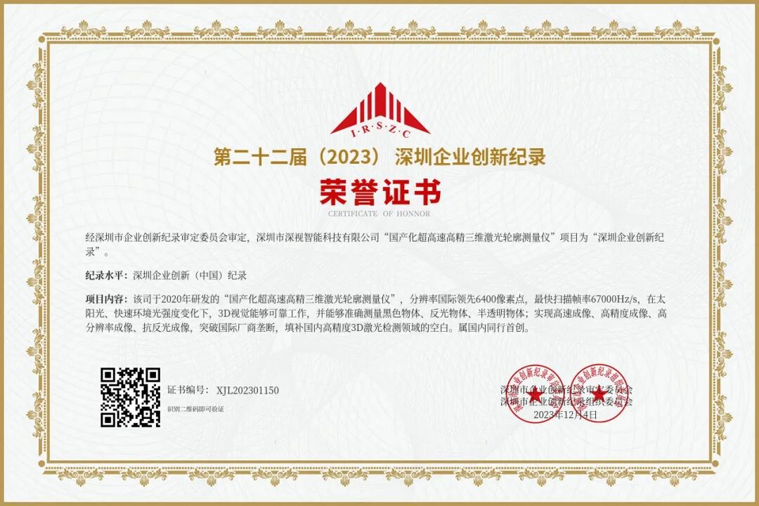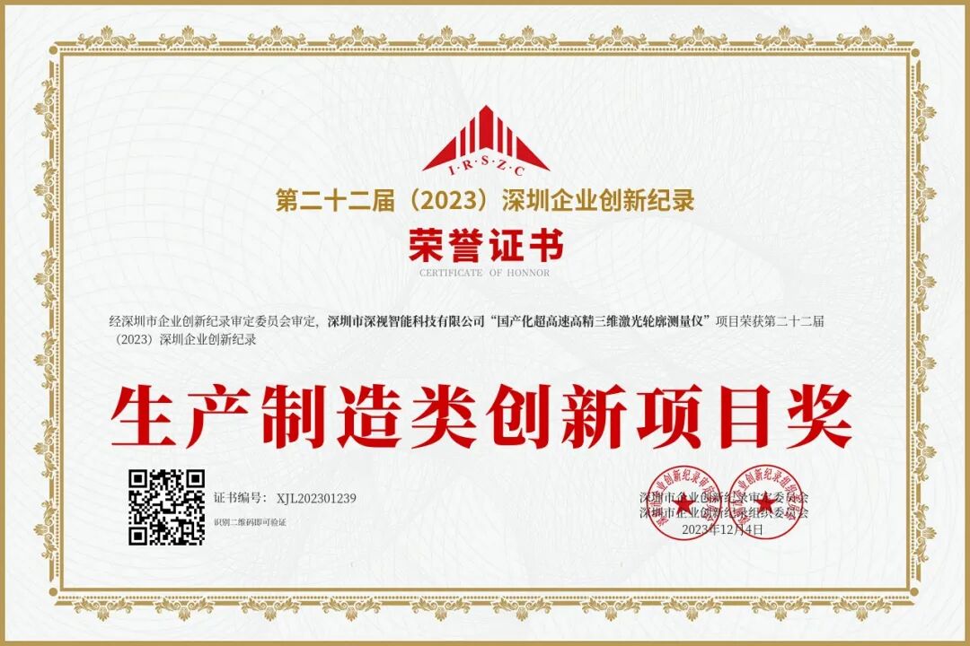 凭借细分领域的创新能力和技术实力,深视智能在此次大会上被授予第二十二届(2023)深圳企业创新纪录“自主创新新锐企业”称号,彰显了深视智能产品创新活力和科技自信风采。其中,科研项目“国产化超高速高精三维激光轮廓测量仪”成功获得“第二十二届深圳企业创新纪录”以及“生产制造类创新项目奖”荣誉。