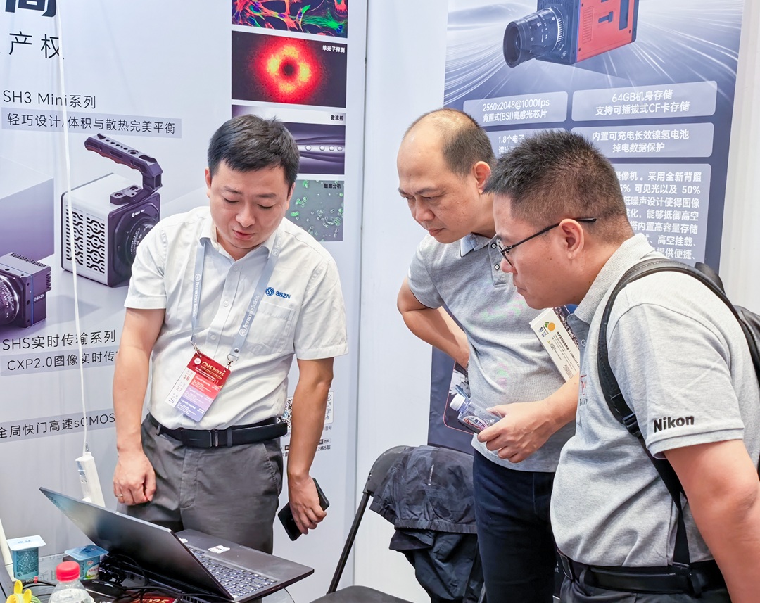 会议期间,深视智能展台气氛热烈。众多专家学者就产品性能与应用前景踊跃提问,与我们的技术专家展开了深入交流。他们对深视智能科学相机在弱光条件下的高效探测能力表现出浓厚兴趣,积极参与现场演示,并围绕技术原理、实验适配及操作细节等方面展开探讨,我们的技术团队均予以专业细致的解答。