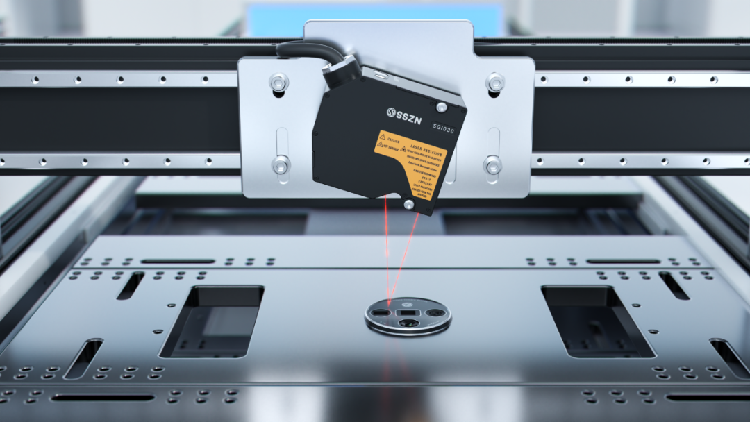 在生产过程中,使用单个SGI030激光位移传感器镜面角安装在测量平台上,对摄像头进行逐一检测。传感器发射的激光束聚焦在摄像头光圈支架表面多个目标点,通过三角测量原理,精确测量摄像头表面不同点到传感器的距离。