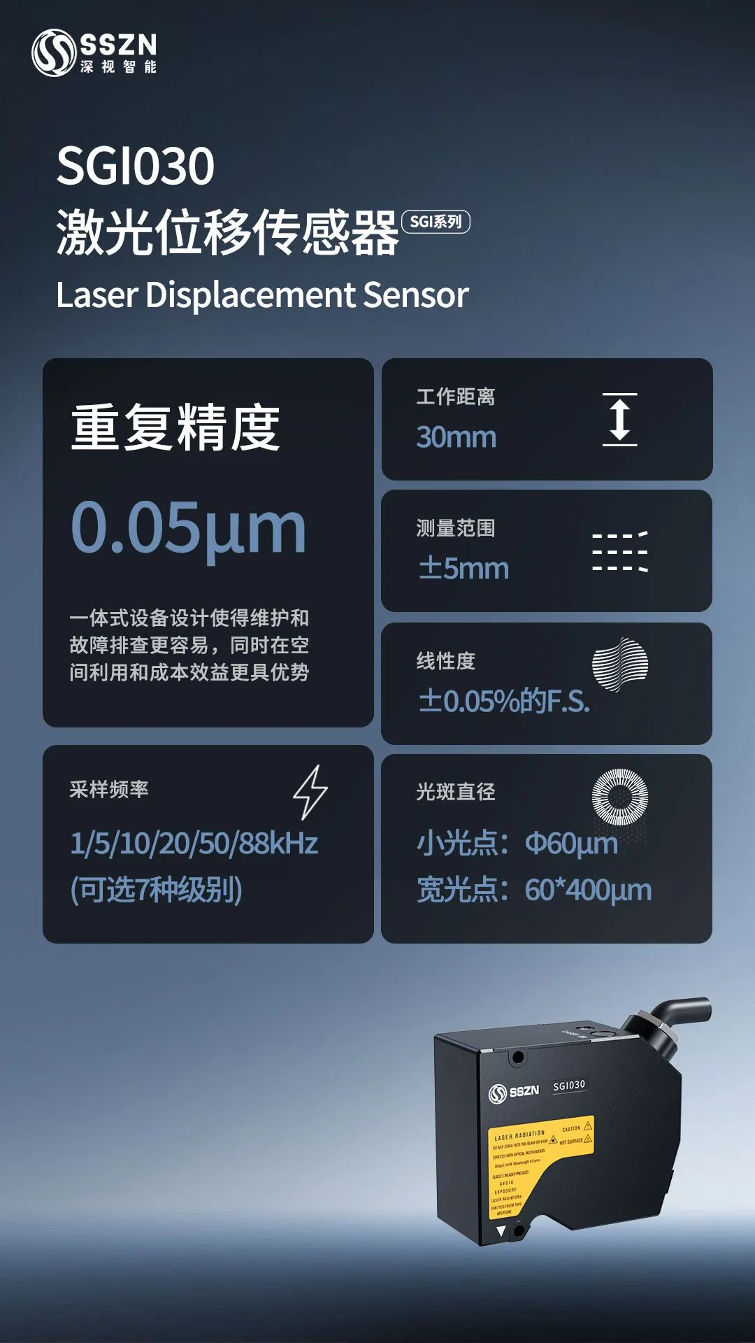 深视智能一体式激光位移传感器SGI系列拥有10种型号,检测范围从-650mm到250mm,重复精度高达0.05μm,线性度可达±0.05% F.S,可依据不同需求灵活选用。