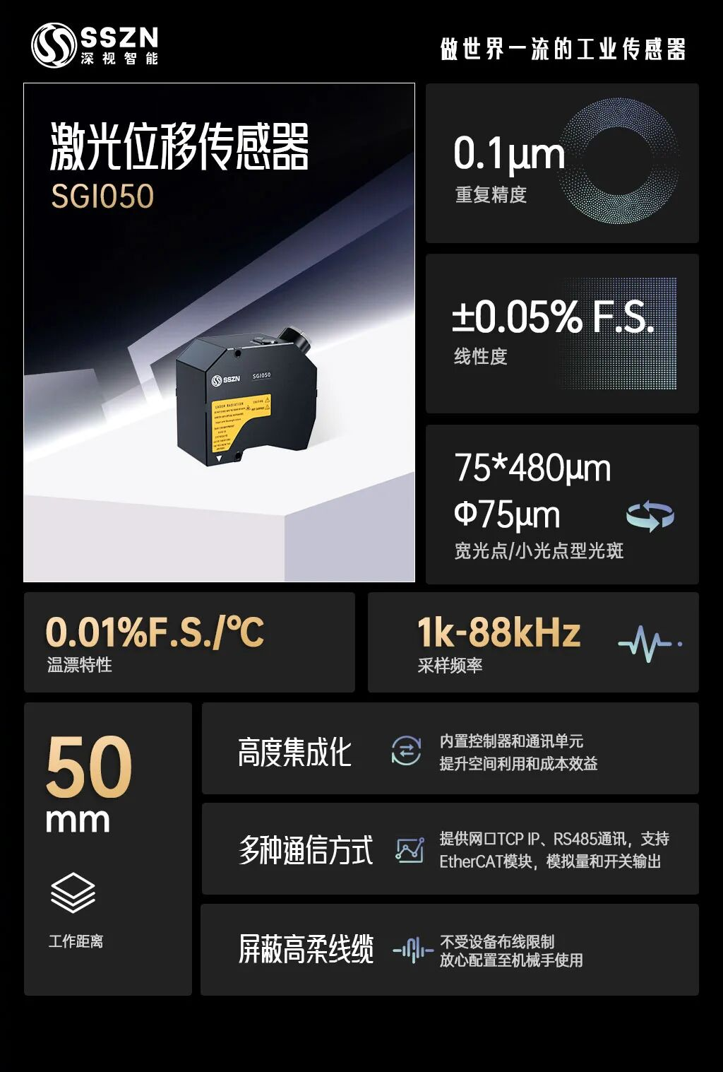 深视智能SGI050激光位移传感器机身采用一体式设计,无需外接控制器,可以轻松嵌入自动化生产线中,节省空间成本并实现即插即用,进一步提升生产效率。