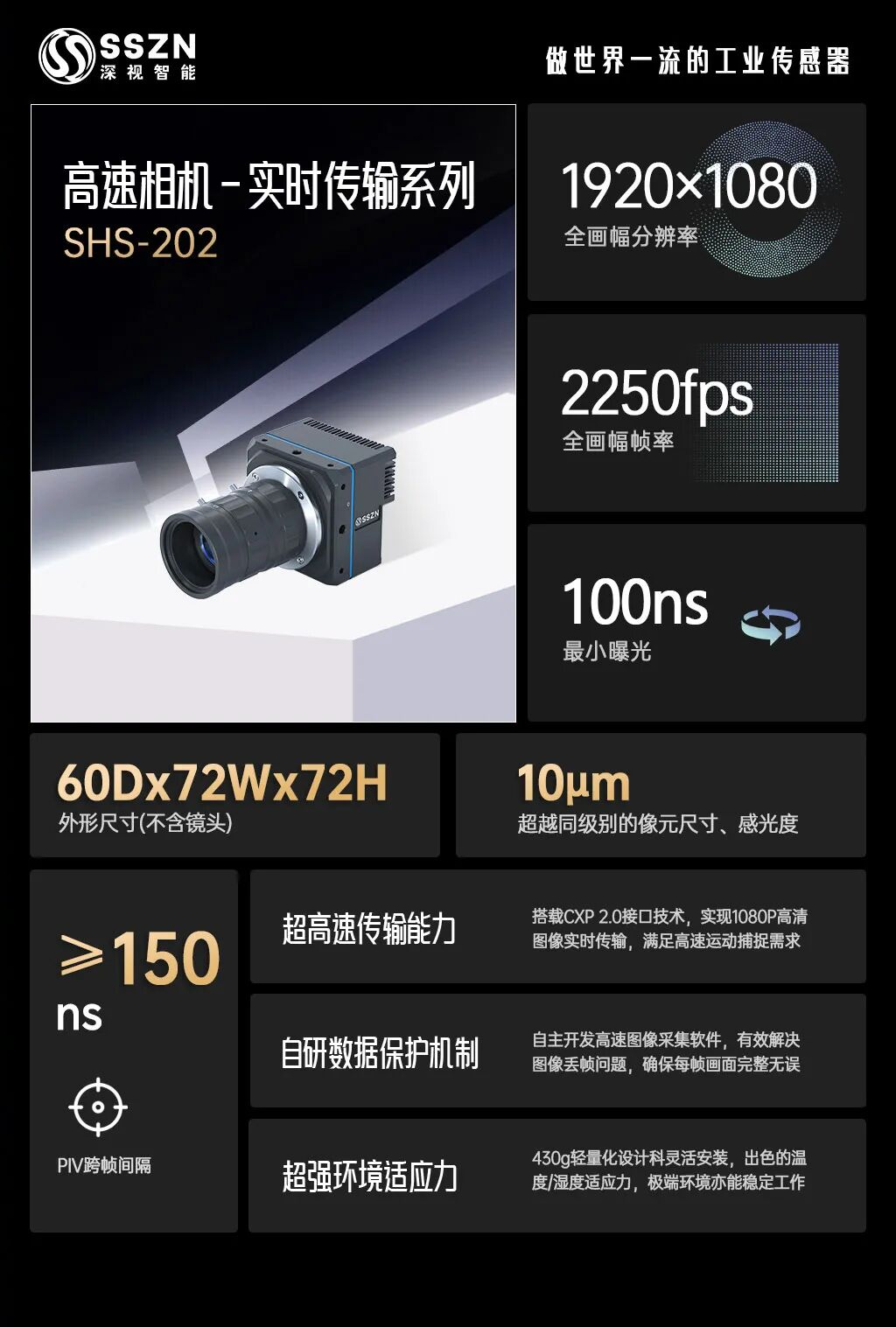 深视智能全新产品——SHS-实时传输系列高速相机搭载行业领先的CoaXPress 2.0传输技术,以 1920×1080 分辨率实现 2250帧/秒 实时图像传输,成为科研实验、工业检测等领域的高效工具。