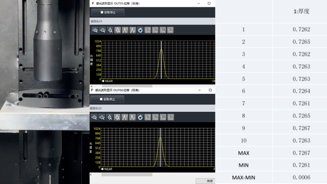 采用激光对射的方式将两个深视智能SCI04025光谱共焦位移传感器分别安装到晶圆的上方和下方,选取晶圆片上的2个点进行测试,计算出晶圆片的厚度。通过载物台移动模拟自动实时测量,测试晶圆片的厚度变化。